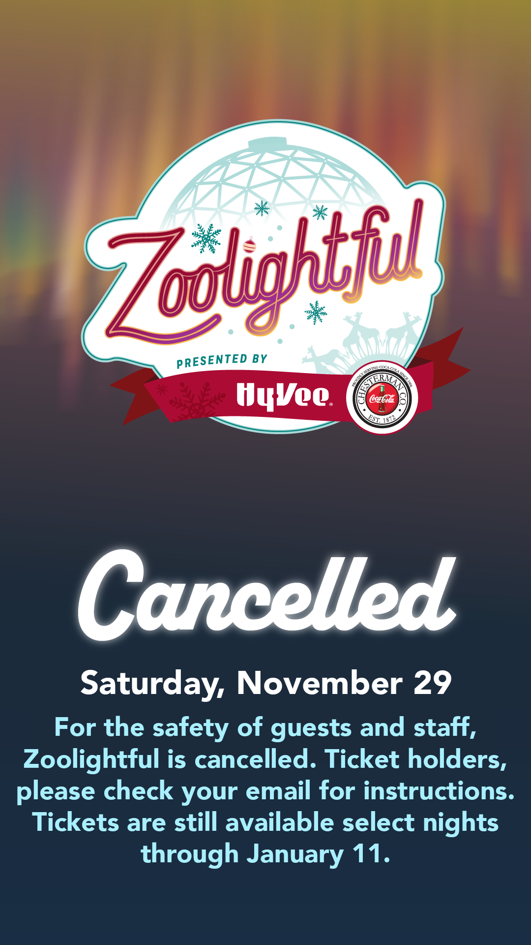 Daytime Zoo admission is not included. Daytime hours close at 5 p.m. Admittance to Zoolightful at 6 p.m. requires a separate event ticket for each visitor.