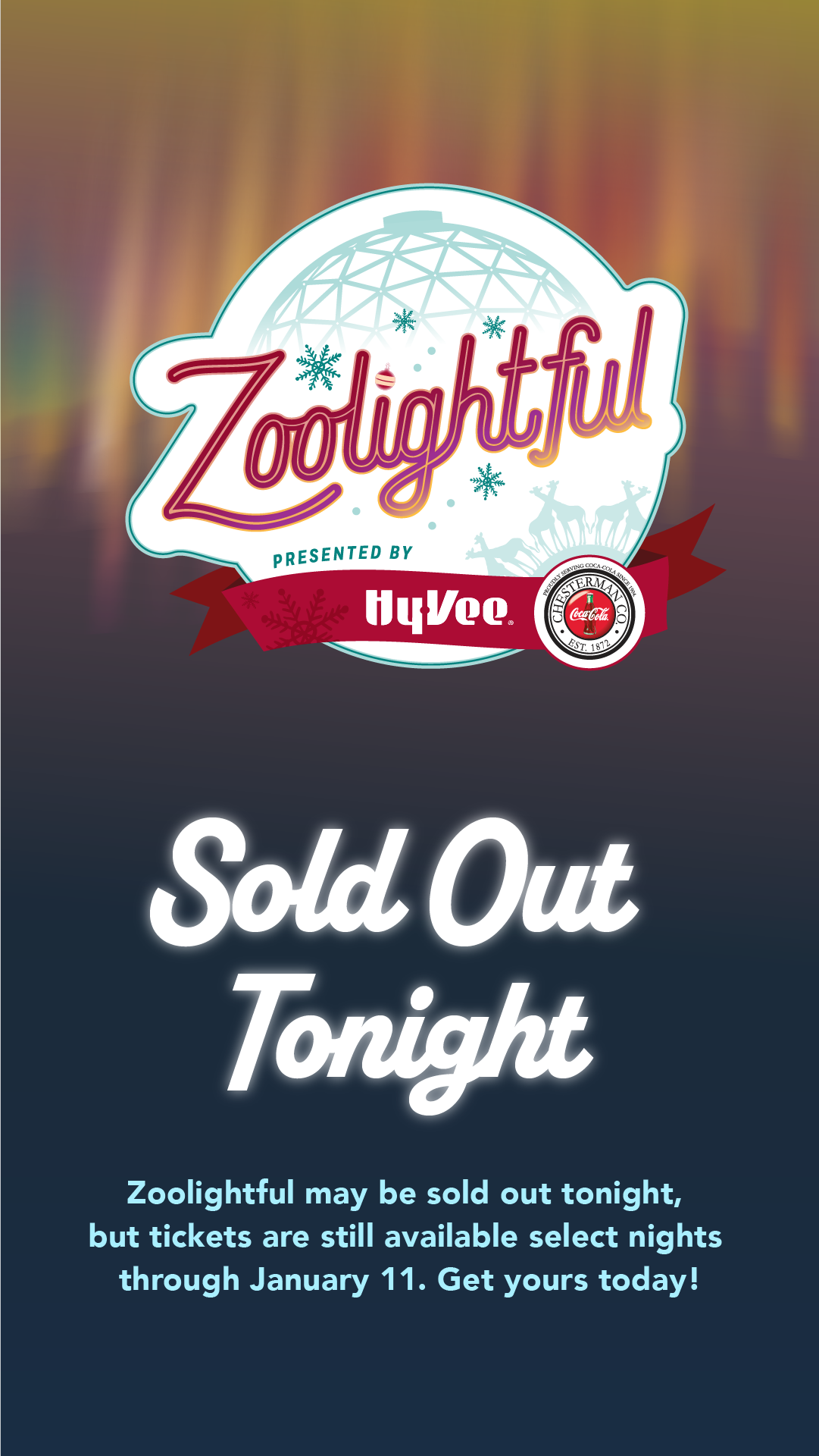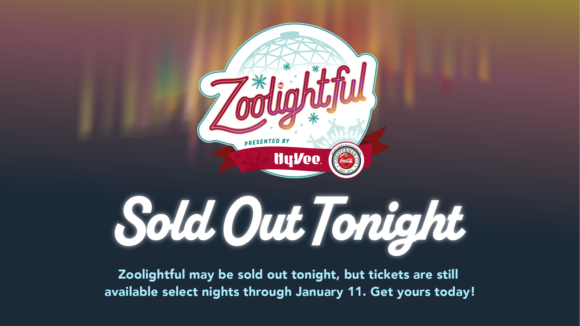 Daytime Zoo admission is not included. Daytime hours close at 5 p.m. Admittance to Zoolightful at 6 p.m. requires a separate event ticket for each visitor.